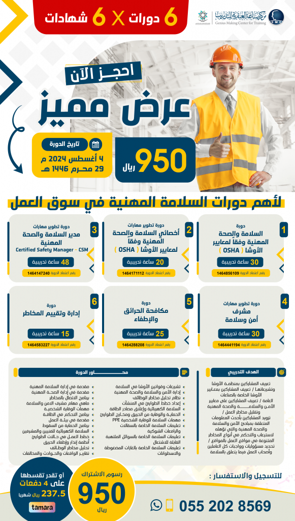 - دورة السلامة والصحة المهنية وفقاً لمعايير الاوشا OSHA .